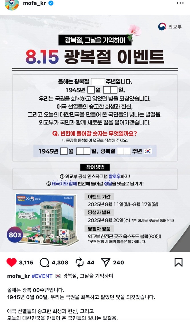 [외교부 EVENT] 광복80주년 영상 시청 인증 이벤트 외교부가 제작한 [광복 80주년 영상 콘텐츠] 중 마음에 드는 영상에 소감 댓글을 남겨주세요! 참여해 주신 분 중 80분을 선정하여 https://www.youtube.co