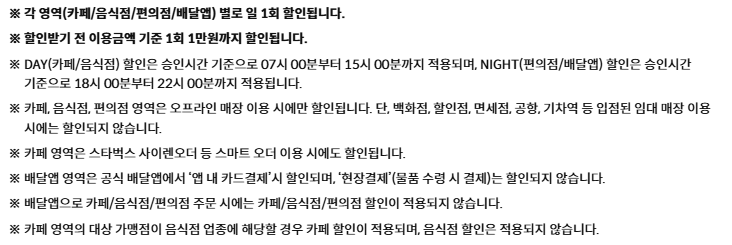 아울렛(신세계, 현대, 롯데 모두), 잡화(올리브영, 다이소) 오홍 1일 1회, 월 5회 할인이 가능하다