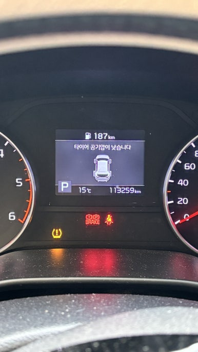 경유 스포티지 차량인데... 저 경고등이 떴다... 하나는 요소수 부족, 하나는 앞바퀴 2개 저압 상태...
