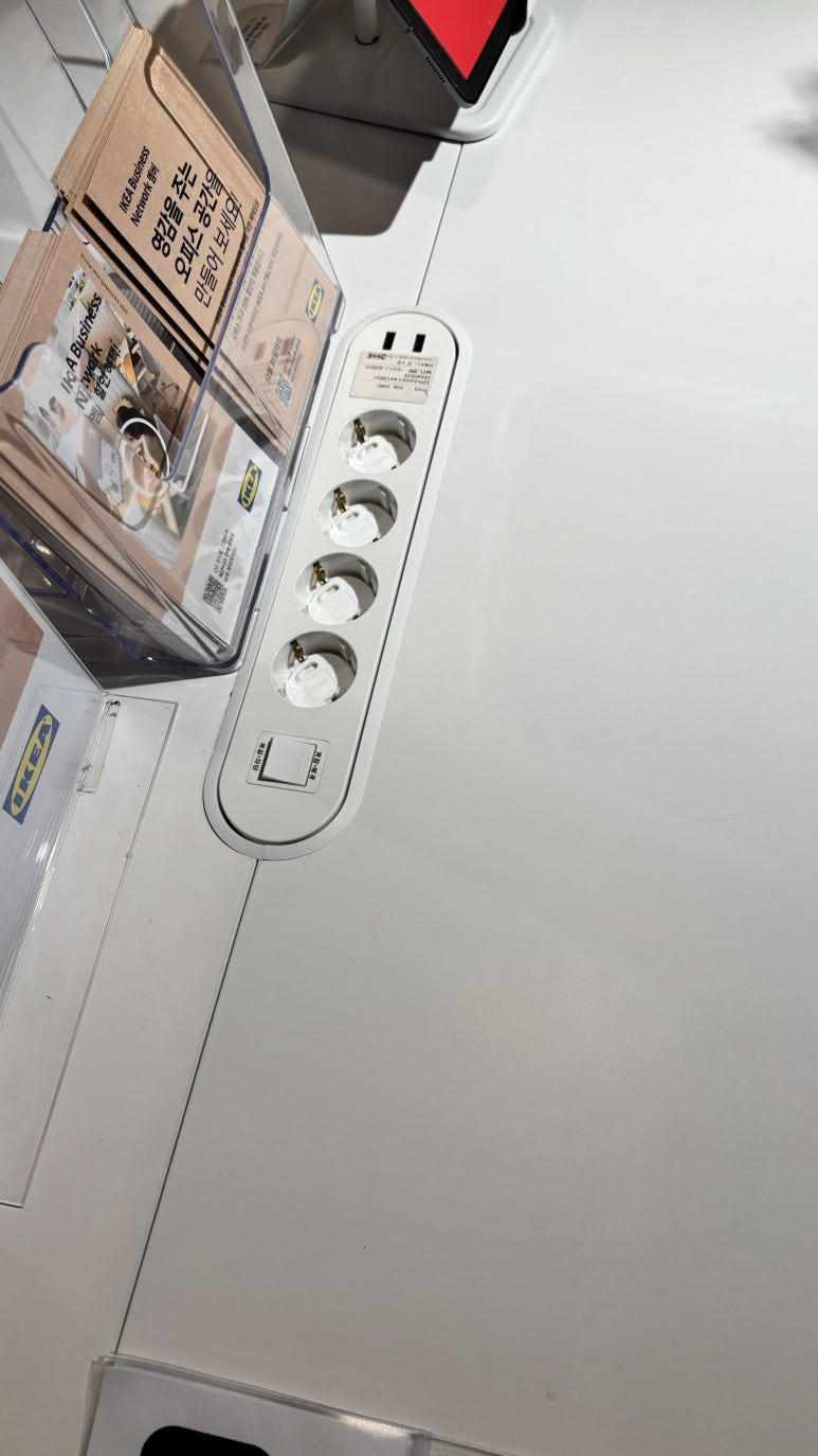 책상 두개 사이에 깔끔하게 매립된 콘센트 ~
