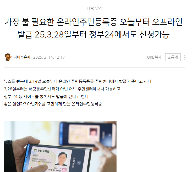 가장 불 필요한 온라인주민등록증 오늘부터 오프라인 발급 25.3.28일부터 정부24에서도 신청가능