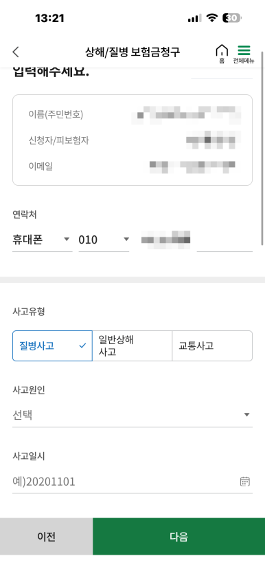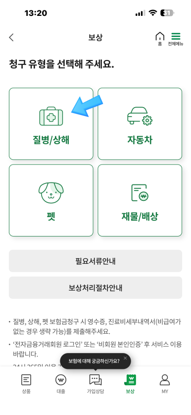 상위 메뉴중 보험금 청구 클릭! > 청구 유형에는 질병/상해 클릭~~!